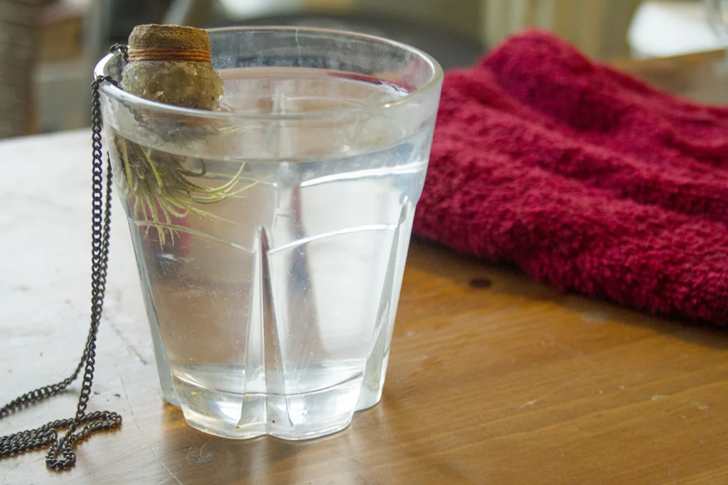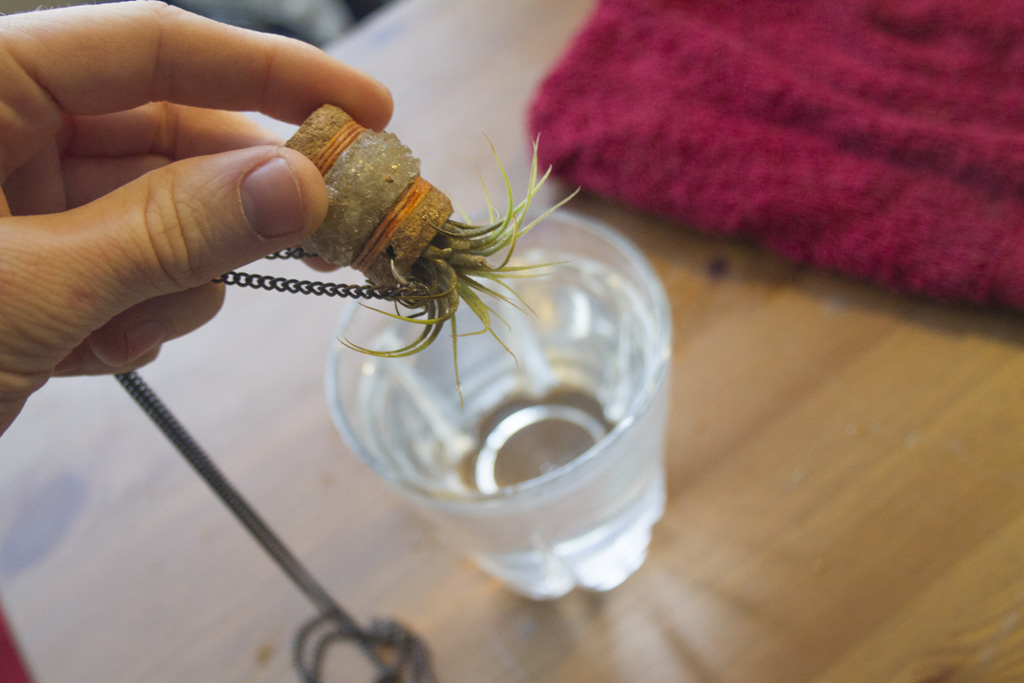 Most of our necklaces are planted with a Tilandsia, from the Bromeliad family. There are over 500 species of Tilandsia native to the subtropical regions of Florida, California, Mexico, and South America and they are typically found on the side of trees and in shaded areas. Tilandsia use their roots to attach to the tree rather than to gain nutrients. These small, hardy plants are a type of Epiphyte, meaning they gain their nutrients and water through their leaves.